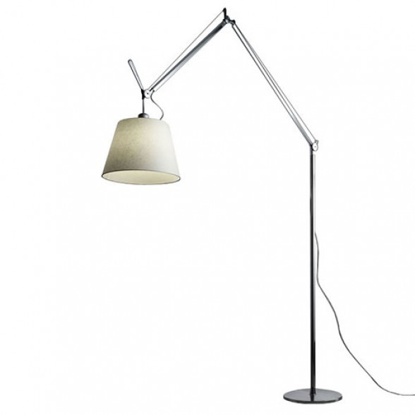 Base in alluminio lucidato; struttura a bracci mobili in alluminio lucidato; diffusore in carta pergamena supportato da materiale plastico; snodi in alluminio brillantato. Diffusore orientabile in tutte le direzioni. Sistema di equilibratura a molle.