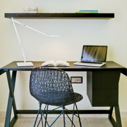 Apparecchio di illuminazione da tavolo a luce diretta, con doppio braccio a pantografo e testa orientabile. Corpo in lega di alluminio colato. Testa esterna in alluminio pressofuso con diffusore in metacrilato stampato ad iniezione. Copertura esterna della BASE in ABS. Struttura ottenuta da un tubolare quadrato in lega di alluminio estruso (12 x 12 mm) lavorato meccanicamente al fine di consentire l’alloggiamento e lo scorrimento al suo interno delle molle di compensazione in acciaio inox e dei pattini stampati ad iniezione in resina acetalica. I tiranti esterni sono in filo d’acciaio diametro 3 mm. Disponibile nelle finiture bianco, antracite, nero o cromo. L’interruttore ON/OFF è elettronico ed è dotato di funzionamento ottico alloggiato nella testa. Due possibilità di scelta: – IMPOSTAZIONI PERSONALI (interruttore arancio) Regola l’intensità della luce come preferisci. – GREEN MODE (interruttore verde) Ora Kelvin LED diventa Green, risparmiando sempre più energia grazie alla sua compensazione automatica della luce dell’ambiente.
